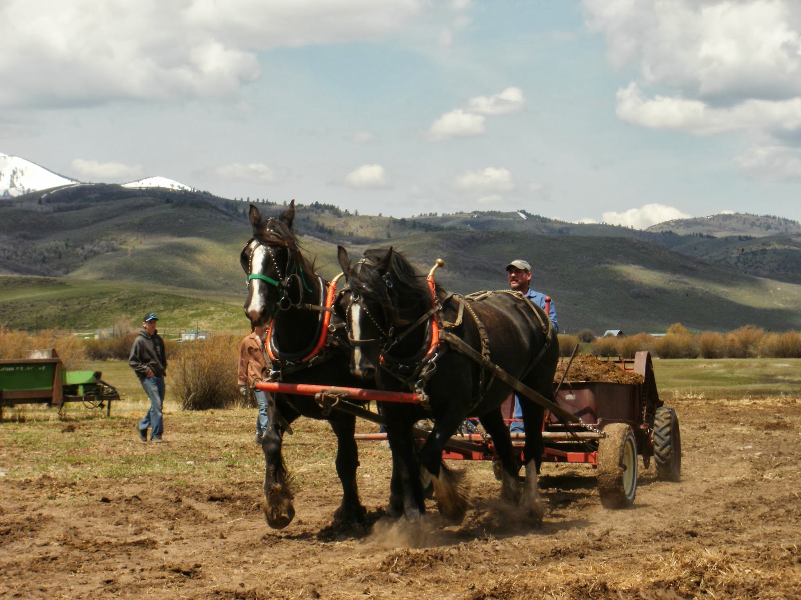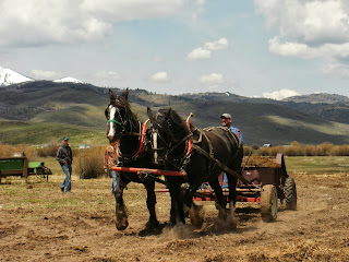 In 2008 my second oldest daughter married a local rancher who's father also had a love for driving teams of horses.  The pictures you have been viewing in this blog is of one Sunday three years ago when we all decided to get together and work some ground.  My daughter's father in law saved 120 acres to be plowed and fertilized.  He had some corrals that needed cleaning out so we went to town "spreading sunshine"!  What a fun family experience.  Beautiful warm spring weather and great company.